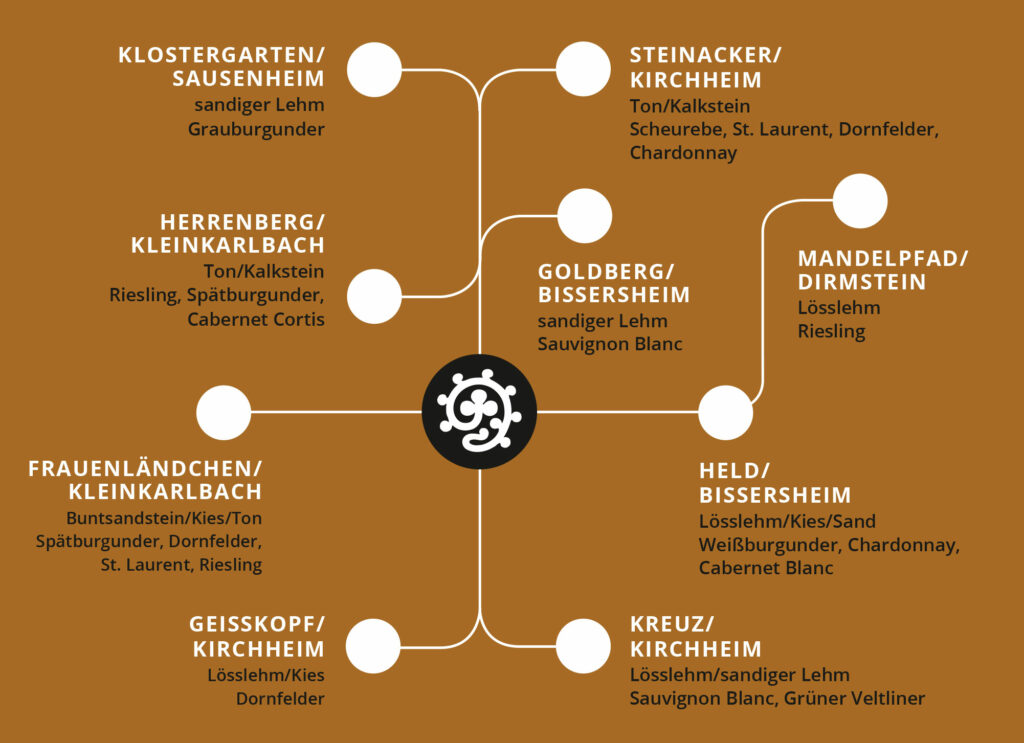 In den Weinlagen rund um Kirchheim haben die Römer bereits vor 2000 Jahren nachweislich die ersten Reben angepflanzt, die Weine in Flaschen abgefüllt und über den Rhein verschifft. Eingebettet zwischen Odenwald und dem Haardtwald hat der Rheingraben in der Pfalz über Jahrtausende eine einzigartige Landschaft mit seinem ganz besonderen Mikroklima geprägt. Mit rund 2000 Sonnenstunden im Jahr entwickelt sich an diesem Ort die mildeste Klimazone Deutschlands, die neben Maronen und Mandeln mittlerweile auch Zitronen, Feigen und Palmen gut gedeihen lässt. Die wechselnden Böden mit überwiegend Sand, Mergel, Ton, Lehm und vor allem Kalkstein bilden eine hervorragende Grundlage zum guten Wachstum von klassisch-traditionellen aber auch modernen Rebsorten wie Chardonnay oder Sauvignon Blanc.
